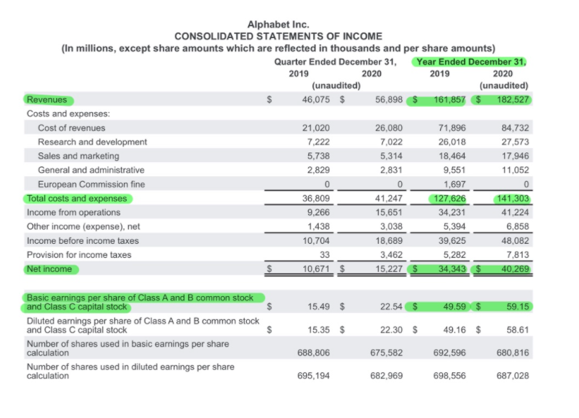 이 자료해서 주목해야 할 부분들은 Net income (순이익)과 Repurchases of capital stock 이다. 2020년 동안 구글은 $40,269,000,000의 순이익을 기록했는데 그 중 상당한 부분을 Repurchases of capital stock 에 썼음을 알 수 있다.